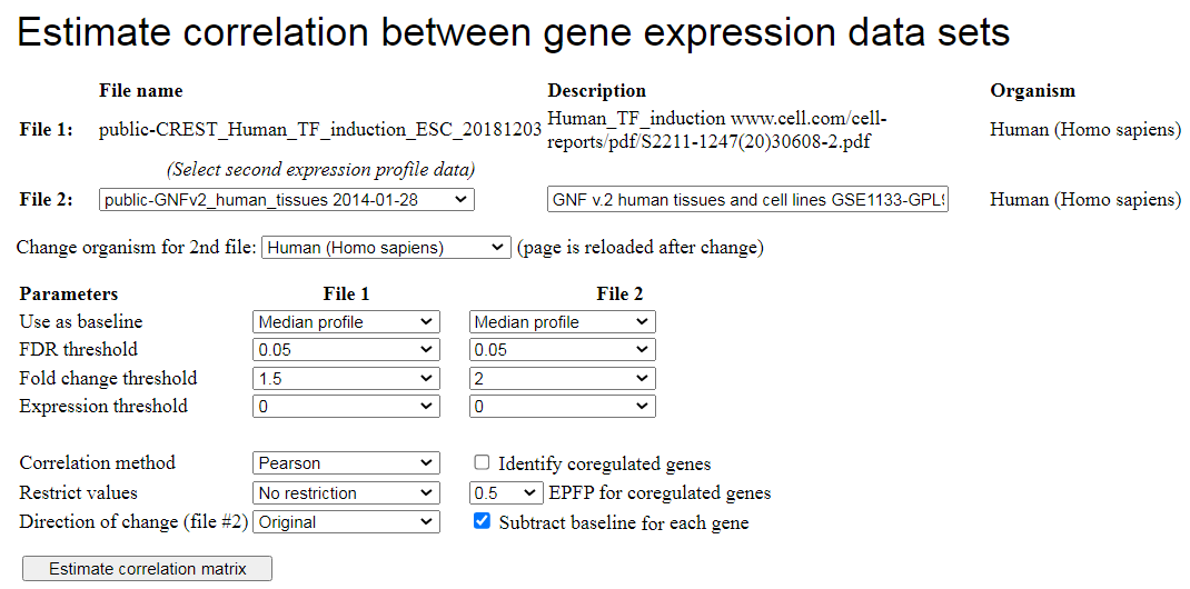 expression matrix can be compared using correlation analysis with any other expression matrix.