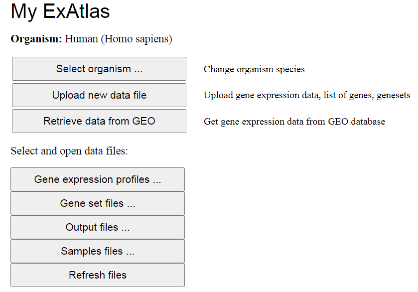 organism species, Uploading new data files to ExAtlas, and retrieving gene expression data files