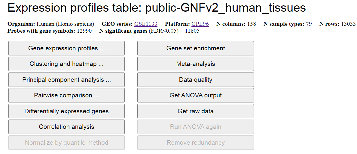 tissues or cell types (button "Differentially expressed genes"), correlation analysis, gene set enrichment