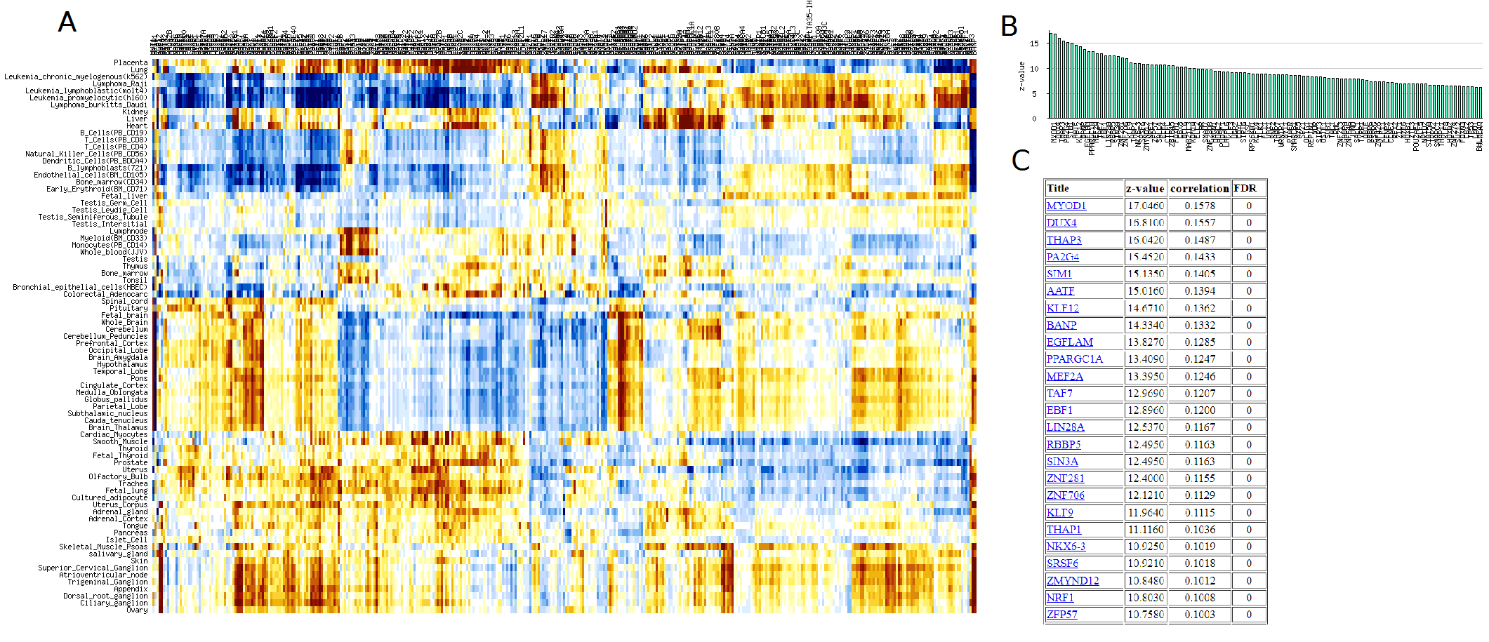 with highest correlation with gene expression in skeletal muscles (C).